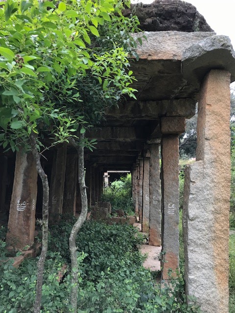 I was a bit wary of loose pillars but walked along what appears to be to two pillared lengths of an obviously rectangular area, with an open courtyard in the middle. Curiously, in the central open courtyard, there was an assembly of three stones. In my royal walk on the corridors, while I curiously tried to figure out the assembly, it was romance ruling the imagination! It did look like a setup to hang a swing, just wide enough to seat two!